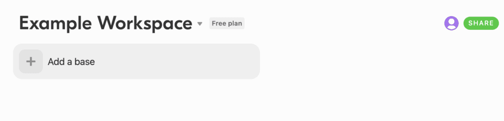 On your Airtable homepage, click “Add a base” in the Workspace you want this CRM to live in. (Don’t worry, you can move your Airtable base to a different Workspace if you decide to structure your account differently as it grows.)