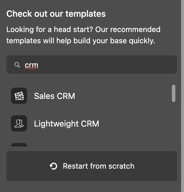 Or, you can select from a number of prebuilt templates if you search for "CRM" in the right hand side of your new base: