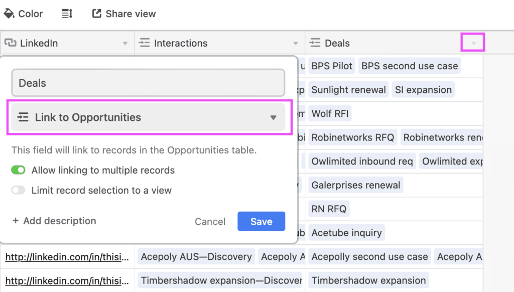 Once you select “Link to another record…” and then you’ll select your Deals table (in the screenshot, the Deals table is called Opportunities.)